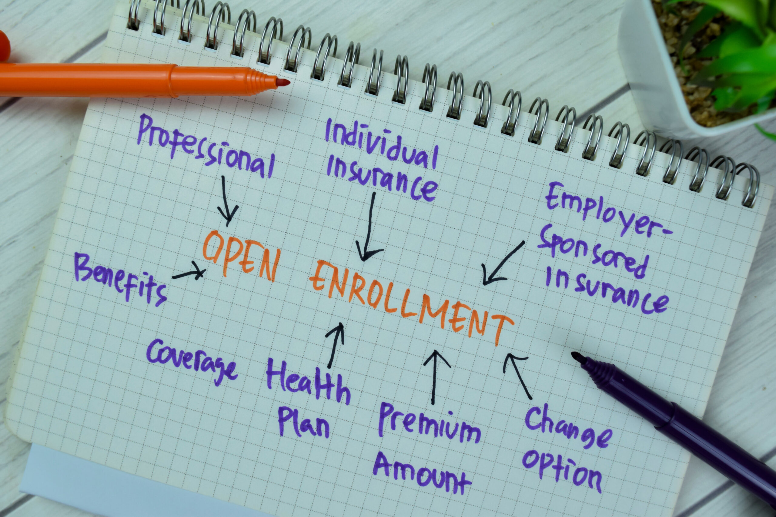 Concept of Open Enrollement write on book with keywords isolated on Wooden Table.
