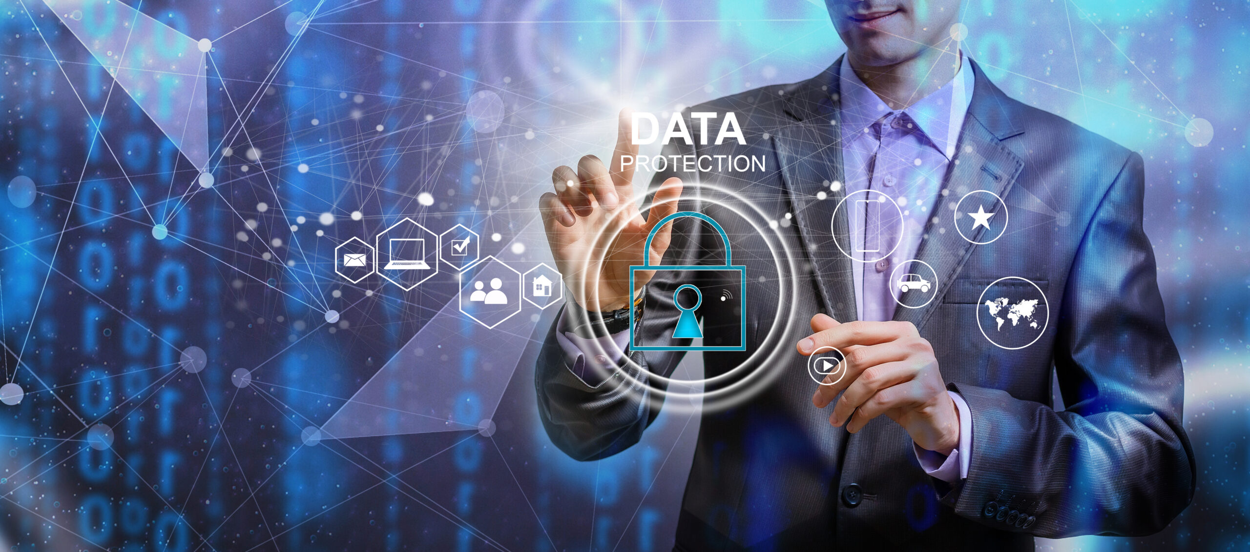 Businessman protecting data personal information on tablet and virtual interface. Data protection privacy concept. GDPR. EU. Cyber security network. Padlock icon and internet technology networking.